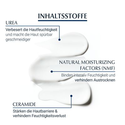 Wirksubstanz Urea, Natrium-5-oxo-DL-prolinat, Sonnenblumenöl, DL-Alanin, Carnitin, Glycerol, Cocosglyceride, hydriert, Triglyceride, mittelkettige, Shea butter, Natrium-(RS)-lactat, erythro-N-(1,3,4-Trihydroxy)octadecan-2-yloctadecanamid, Milchsäure, Arginin hydrochlorid